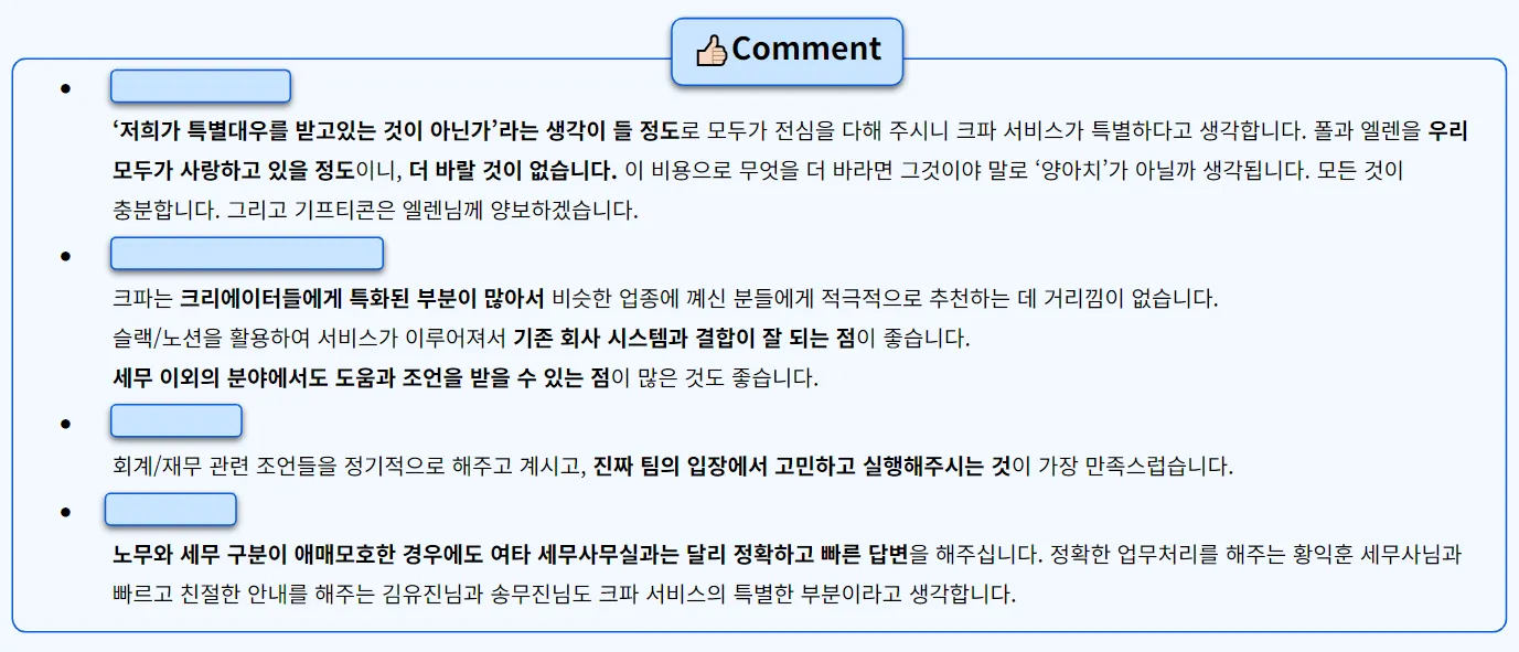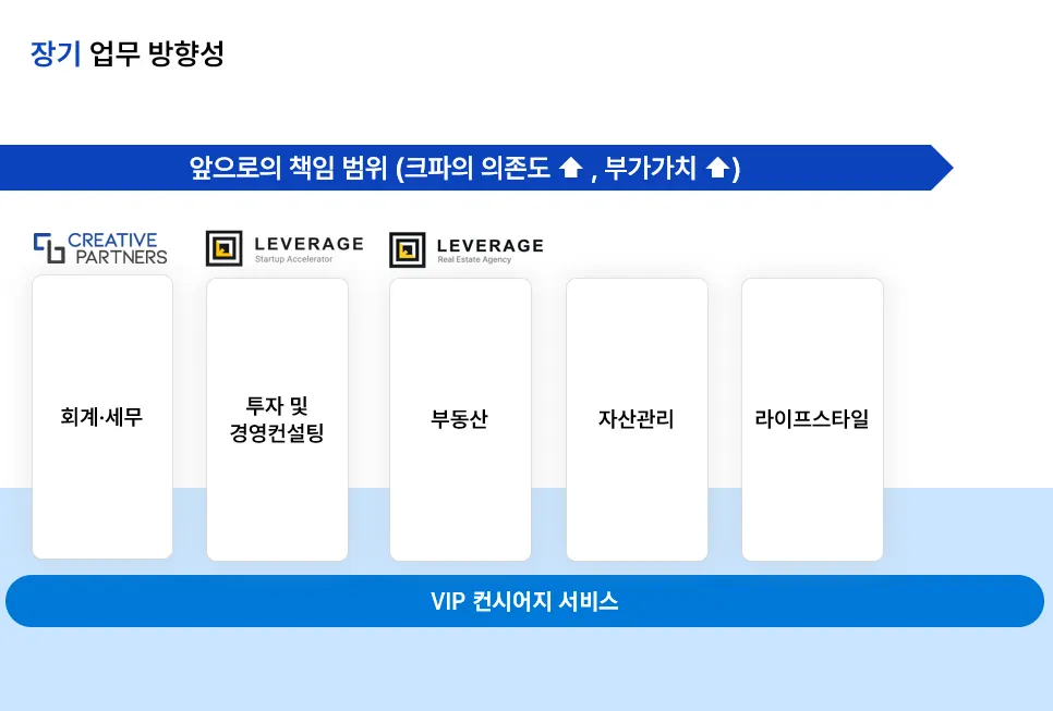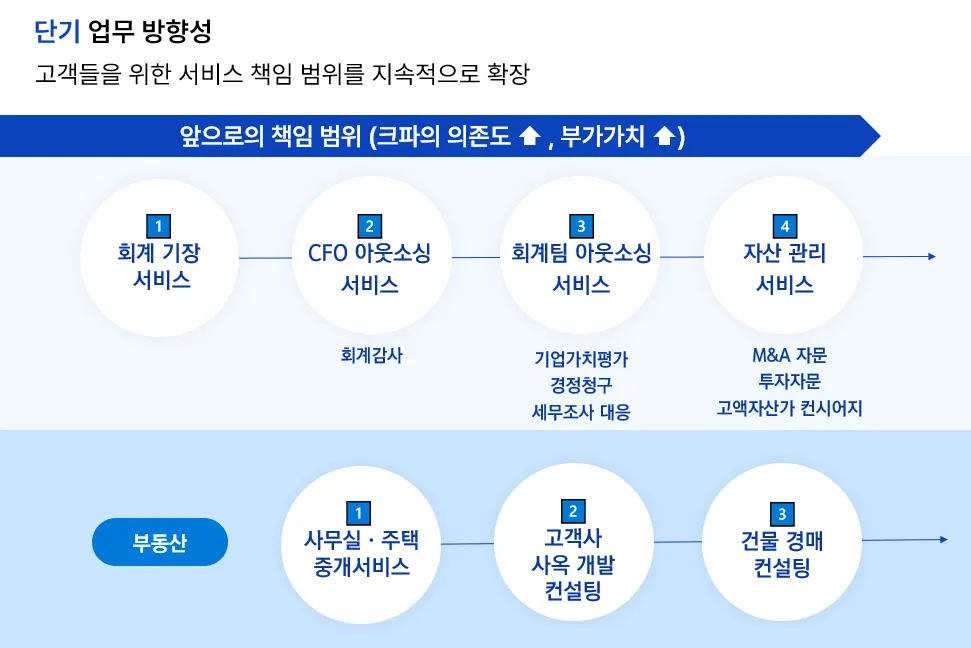 크파의 책임 범위를 지속적으로 확장하기 위해 현재 회계/세무 → 투자 및 경영컨설팅 → 부동산까지 서비스를 확장하였습니다.