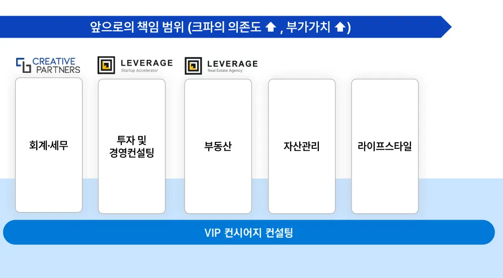 고객들의 세무회계 정보를 바탕으로 부동산 니즈를 뾰족하게 파악하여 부동산 중개 서비스를 제공하고자 합니다. 계열사로 래버리지부동산중개법인을 설립하였으며, 크파와 fit이 맞는 젊고 유능한 공인중개사님을 대표로 선임하였습니다. 앞으로 고객사 대표님들의 주거용 부동산, 고객사의 상업용 부동산을 중개할 예정이며, 증권사로부터 자금조달을 통해 대형 오피스를 사옥으로 개발하는 프로젝트도 진행 예정입니다.