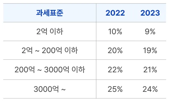 법인 사업자의 세율도 개인사업자와 같이 누진세율 구조이며, 4단계로 구분된다.