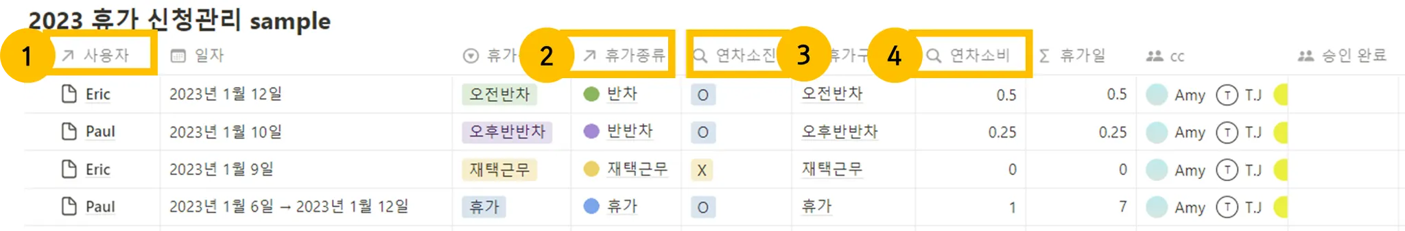 → 테이블에 ‘휴가 종류’를 추가하면 해당 항목이 연차가 소진 유무가 자동으로 업데이트