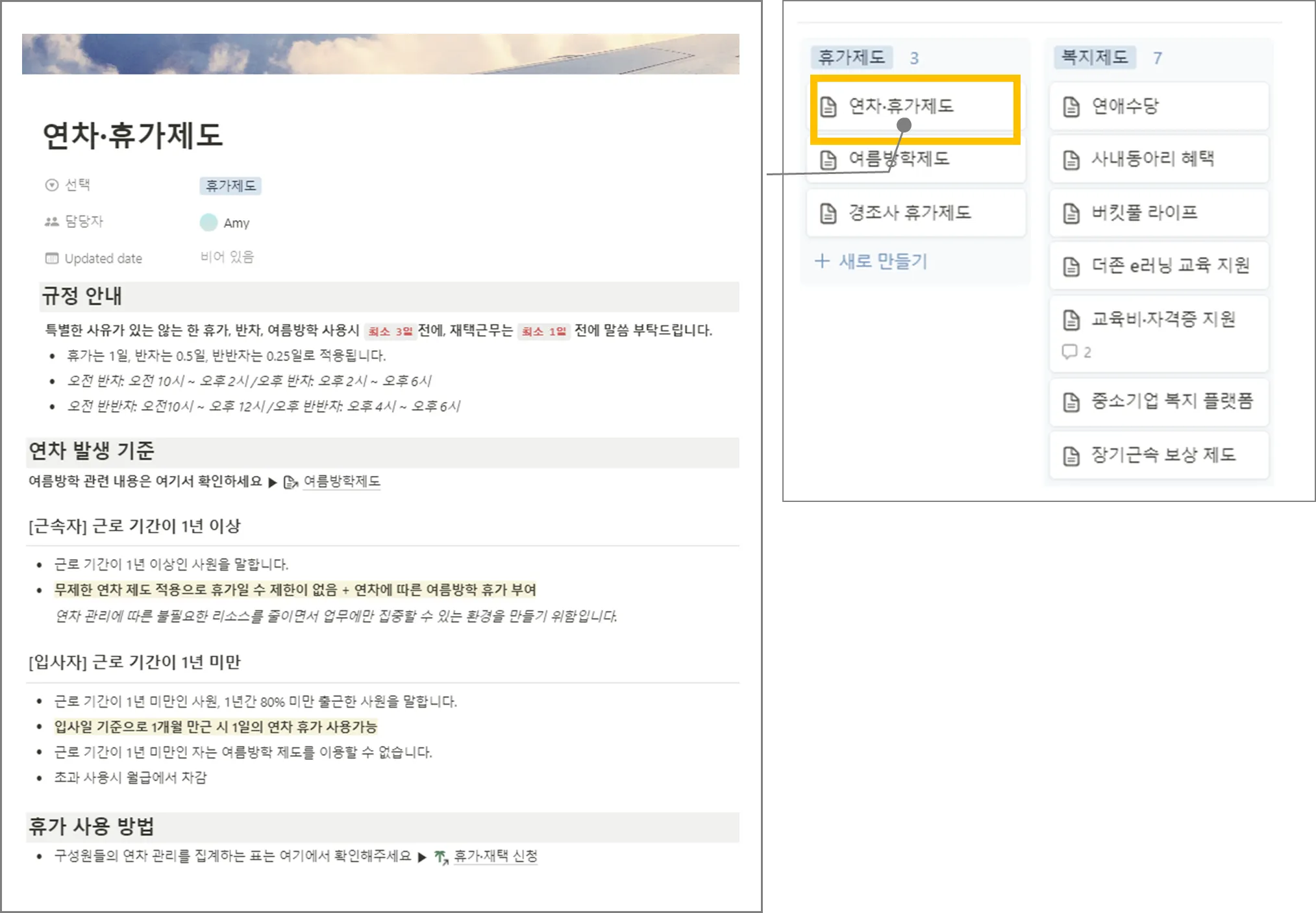 이전 글에서 한번 올린 적이 있었는데, 모든 멤버들이 볼 수 있는 페이지에 모든 제도에 대해서 정리해둔 페이지가 있다(아래는 일부분이다). 여기에 연차, 휴가 제도를 최대한 자세하게 설명해둔다.