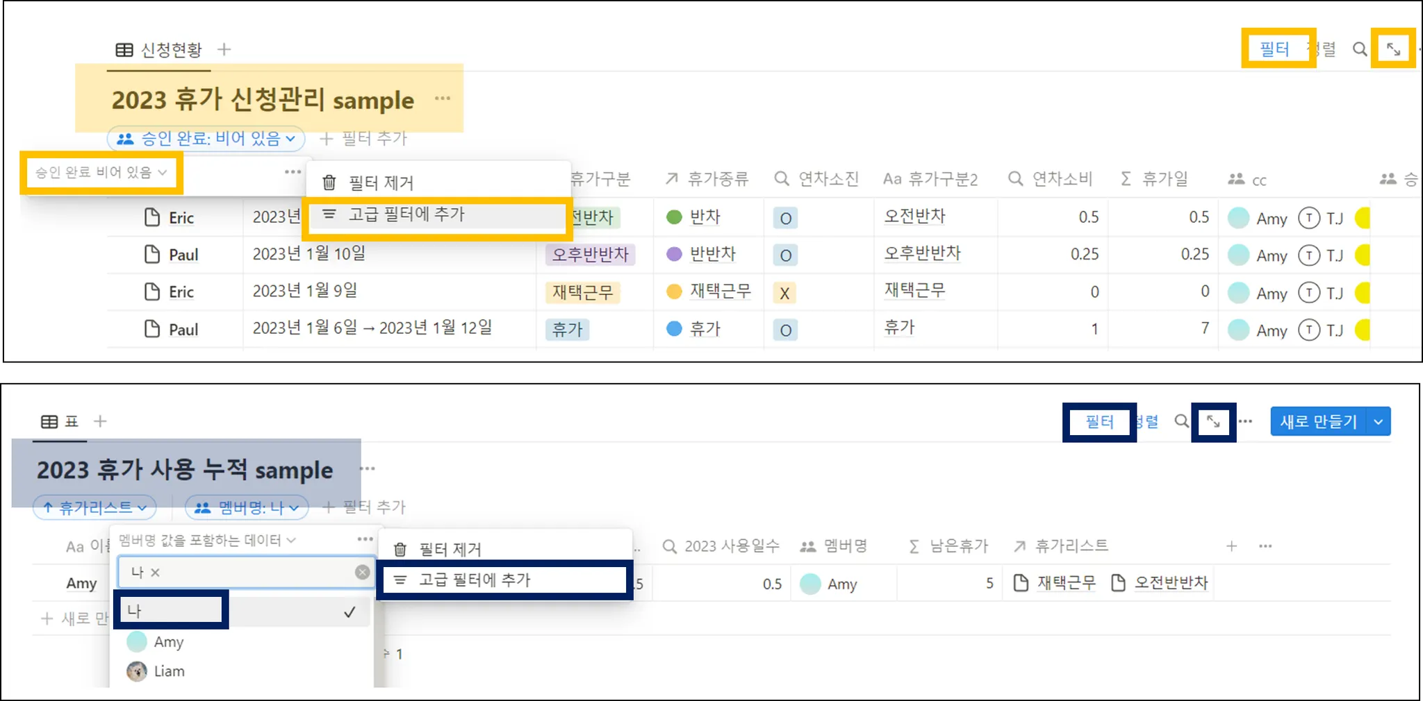 2023 휴가 신청관리 sample: 테이블 오른쪽에 필터 → ‘승인 완료-비어 있음’으로 설정 → 고급 필터에 추가 를 클릭한다→ 승인 완료된 휴가 리스트는 해당 테이블에서 보이지 않게 됨