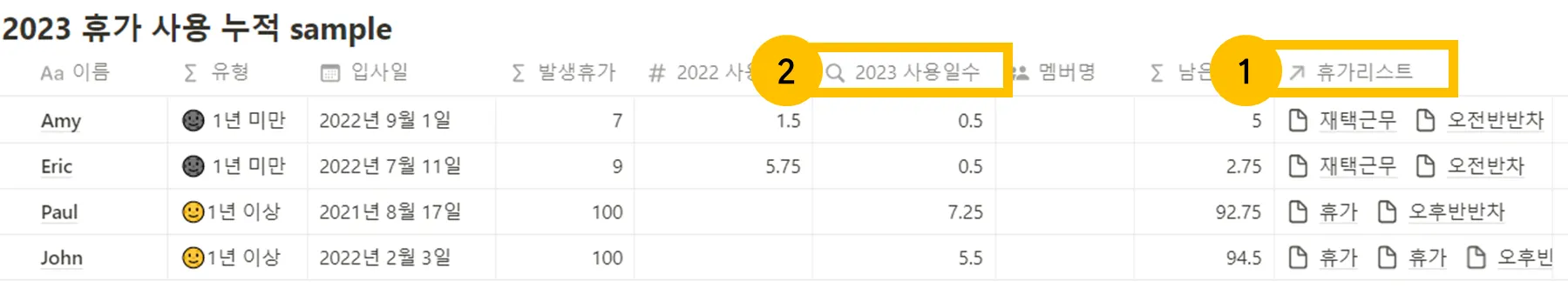 사용자: relation 기능으로 아래 3.멤버별 누적 휴가 사용 리스트 테이블을 연동 한다.