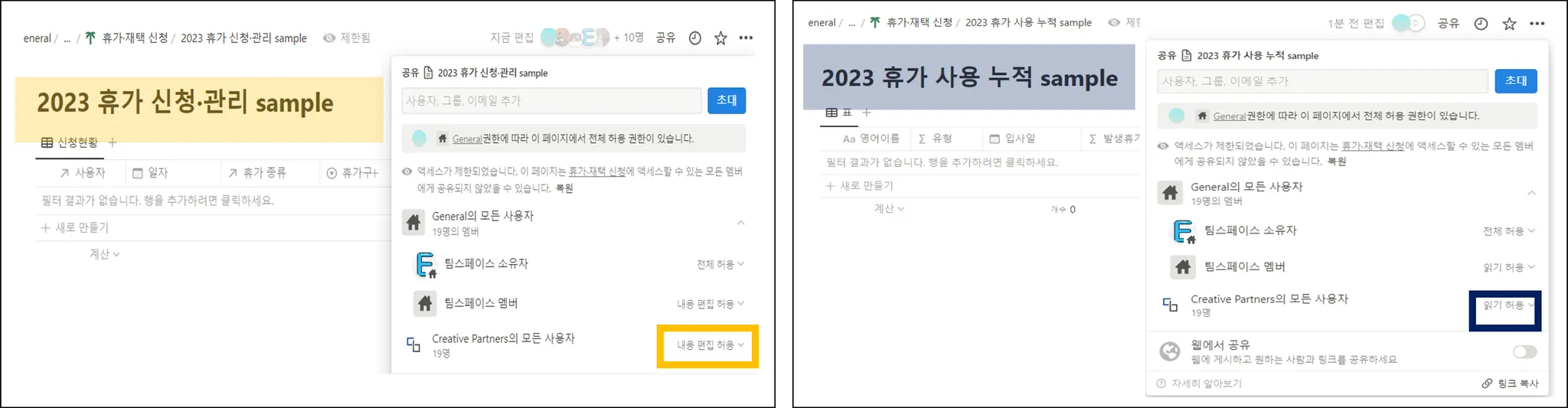 2023 휴가 사용 누적 sample: 관리자를 제외 한 모든 멤버들을 ‘읽기 허용’으로 설정해준다.