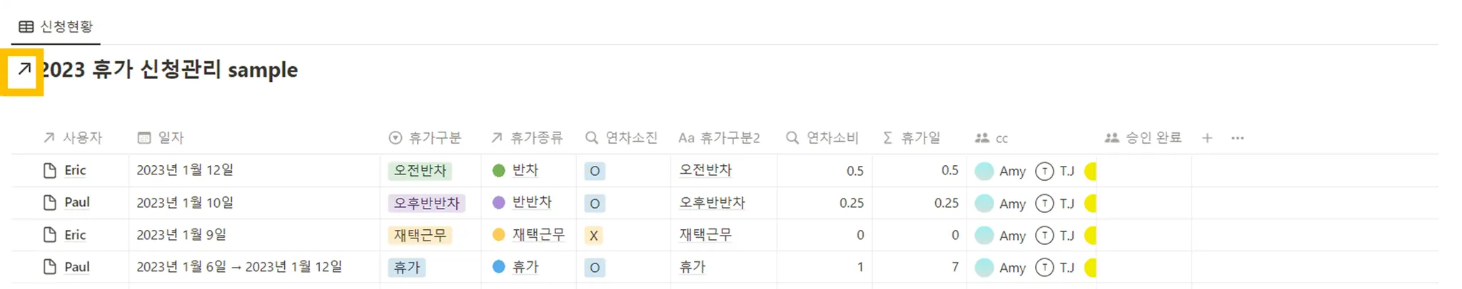 관리자 페이지는 매우 심플하다. 지금까지 작업한 테이블을 동기화 기능으로 그대로 갖고 오기만 하면 되기 때문이다. 별도로 페이지를 생성해서 휴가를 승인하고 취소할 수 있는 관리자만 초대를 해주면 된다. 관리자는 모든 멤버들의 휴가 사용 및 누적 휴가 사용을 확인할 수 있으며, 승인된 휴가를 삭제해 줄 수 있는 권한이 있다.