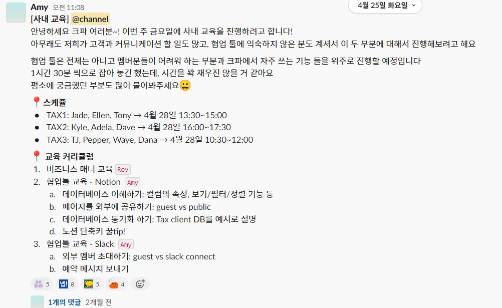 Notion과 Slack같은 협업 툴은 이미 멤버들이 어느정도 익숙해져 있는 상황이다 보니 모든 기능에 대해서 교육을 하진 않았다. 대신 회사에서 자주쓰는 기능이나 어려워 하는 부분들을 위주로 진행하였는데, 특히 외부 공유는 잘못하면 회사의 모든 자료들이 공유 될 수 있기 때문에 최대한 자세하게 설명을 드렸다.