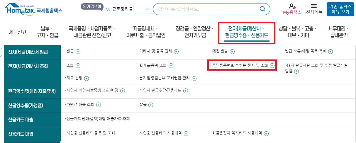 홈택스에 사업자로 로그인 한 후 위 캡쳐본처럼 주민등록번호 수취분 전환 및 조회 탭에서 변경이 가능합니다.