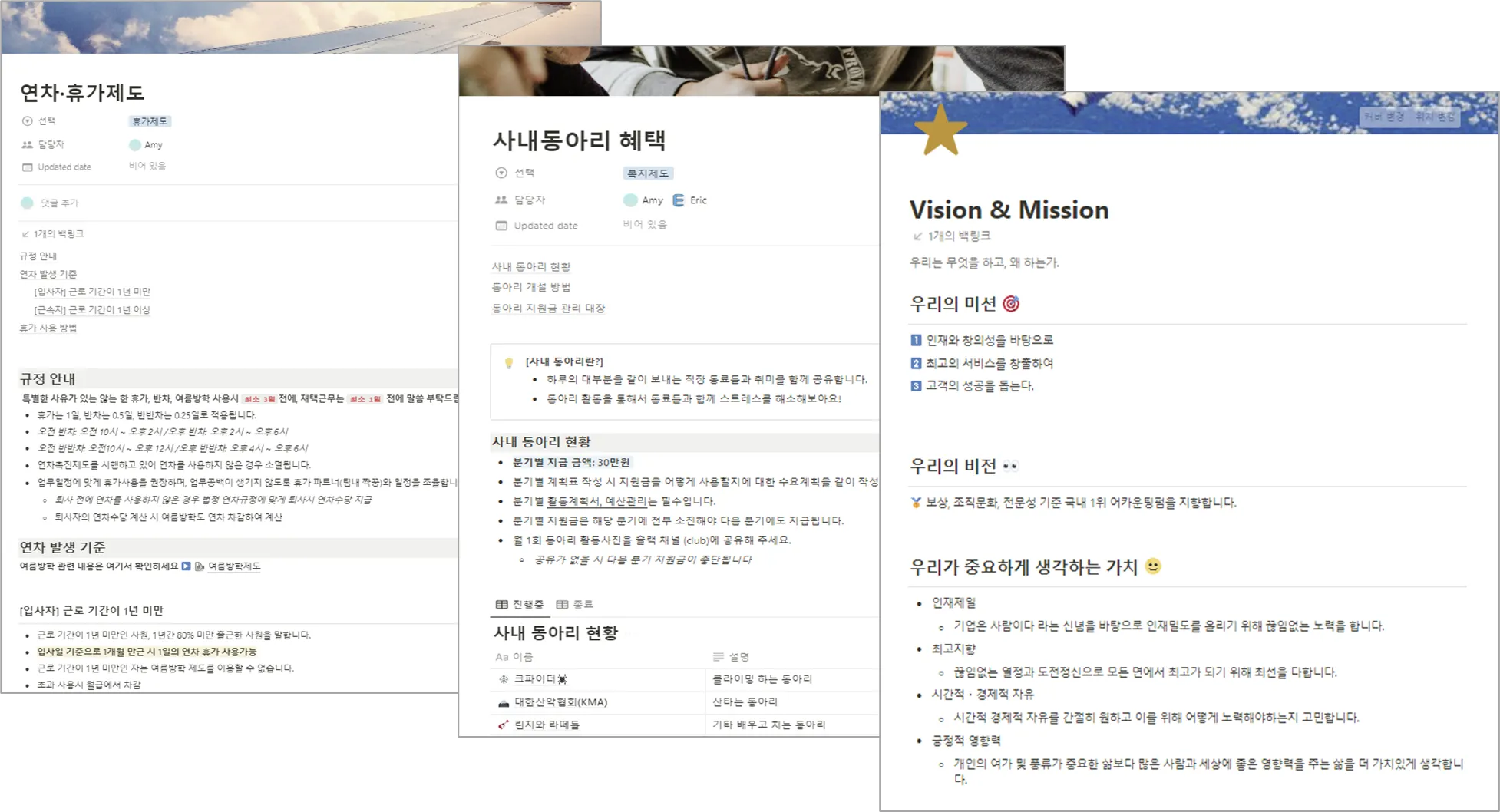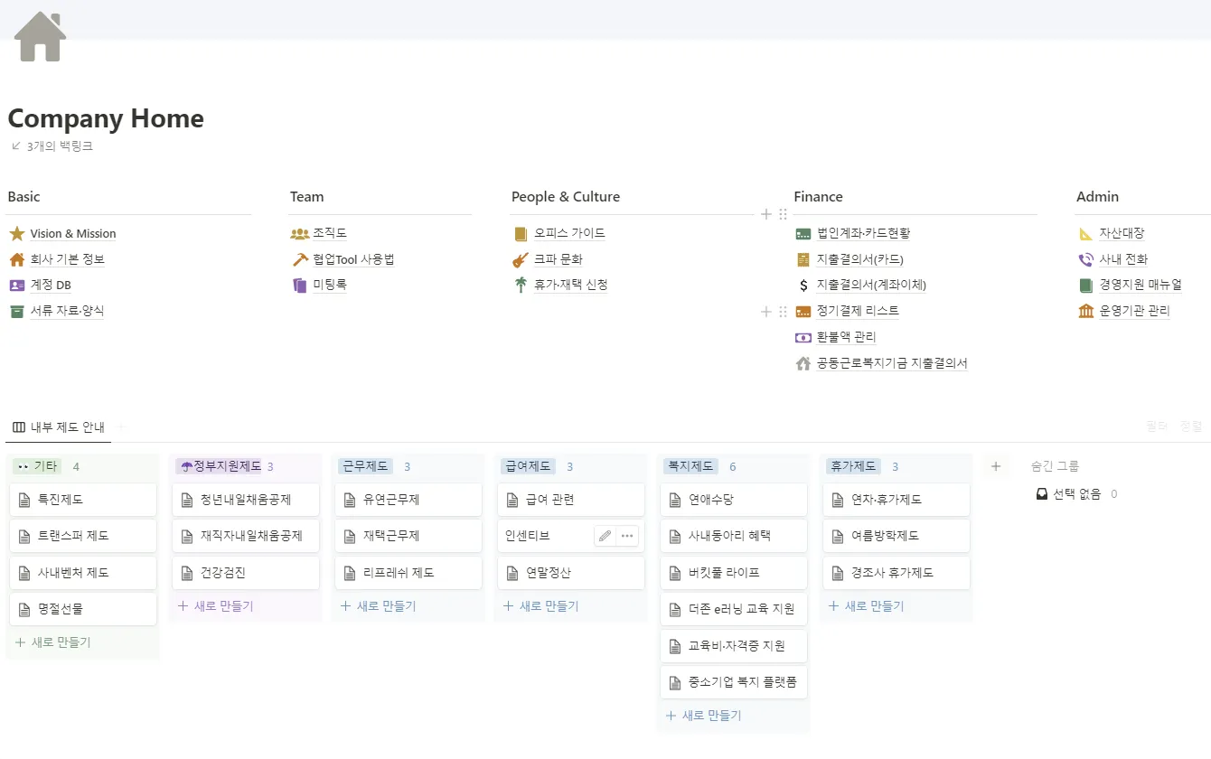 이 때문에 회사의 메인 Notion페이지에는 모든 멤버들이 공통적으로 사용해야 하는 페이지와 제도 등을 정리해서 빼두었다. 휴가 신청, 지출결의서 등과 같은 페이지에 규정과 프로세스 등을 적어 놓고, 제도는 최대한 많은 설명을 해두었다.