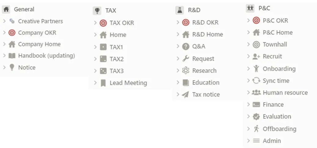 P&C (Peaple & Culture): 인사, 재무 관리, 성과 관리 등을 관리하는 팀 페이지이다. 채용부터 오프보딩까지 일련의 프로세스를 페이지별로 생성해서 관리하고 있다.