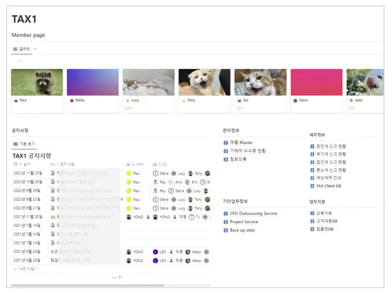TAX: 회계 서비스를 제공하는 팀들의 페이지이며, 계약서, 업무 매뉴얼, 고객 DB 등이 있다.