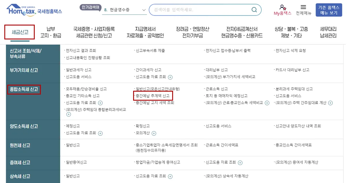 세금신고→ 종합소득세 신고 → 중간예납 추계액 신고에서 내용을 작성할 수 있습니다.