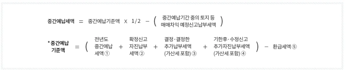 아래 산식에 따라서 중간예납세액이 계산되며, 중간예납 대상자에게는 관할 세무서에서 납부고지서를 발송합니다.