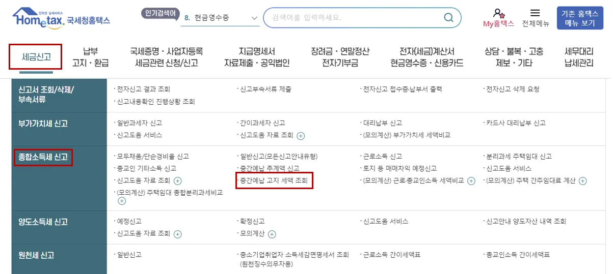 세금신고→ 종합소득세 신고 → 중간예납 고지 세액 조회
