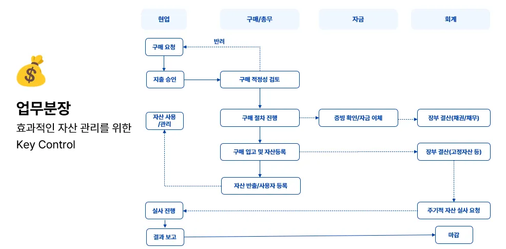 두 번째 이유는 자산의 부실 관리로 인한 회사 자원의 유출을 방지하기 위함이다. 모든 자산이 구매되기 위해서는 적절하게 설계 된 구매 프로세스(혹은 비용 집행 프로세스) 아래에서 진행 되어야 한다. 도대체 자산 관리와 구매 프로세스는 무슨 관계일까? 적절하게 설계된 내부통제 프로세스를 아래 그림과 같이 살펴 보자.