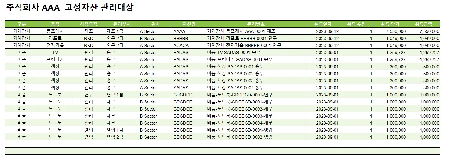 이에 따라, 규모가 너무 커져 시스템에 의존하지 않고서는 파악이 불가능 할 정도가 되기 이전, 아래 엑셀템플릿 정도로 회사 내부의 자체적인 유형자산(고정자산) 관리 프로세스를 구축해 두자. 아래와 같이 관리되고 있는 파일과, 실제 결산이 완료된 장부 상 고정자산 잔액을 크로스 체크 함으로써, 실재성과 완전성, 또한 결산 자체의 오류(유형자산 처리 누락 등)의 가능성을 현저히 낮출 수 있다.