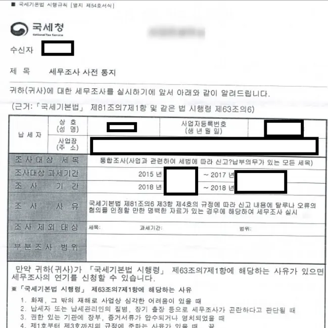 그리고 세무조사는 일반적으로 아래와 같이 세무조사 사전 통지서를 통해 언제부터 언제까지 무슨 사유로 어떠한 세목에 대해 세무조사를 진행한다고 미리 알리고 진행을 한다.