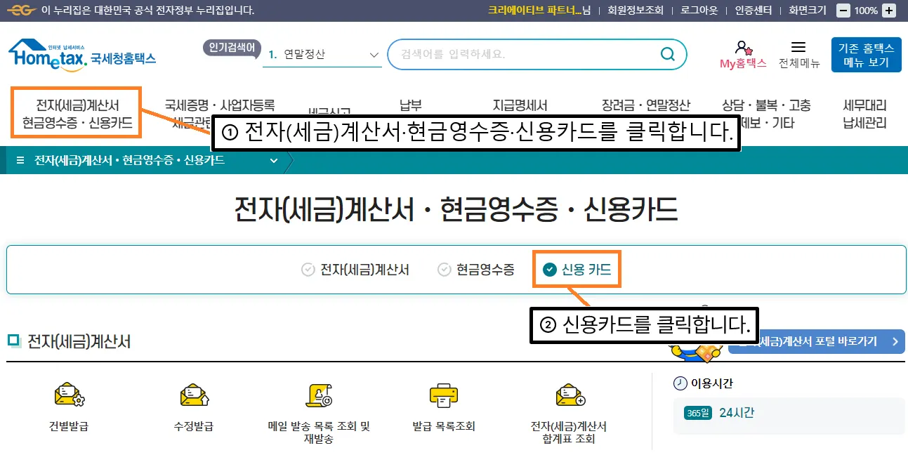 ③ [전자(세금)계산서·현금영수증·신용카드]로 들어간 후 [신용카드]를 선택합니다.