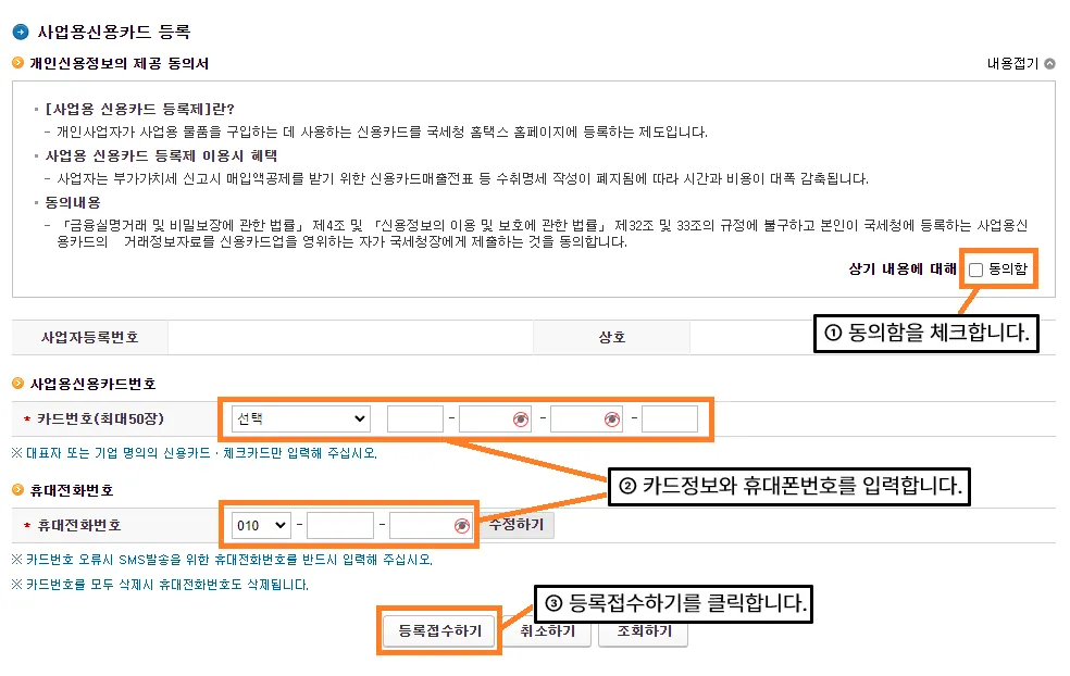⑤ [동의함]을 체크 후 카드정보와 휴대폰번호를 입력 하고 [등록접수하기]를 클릭합니다.