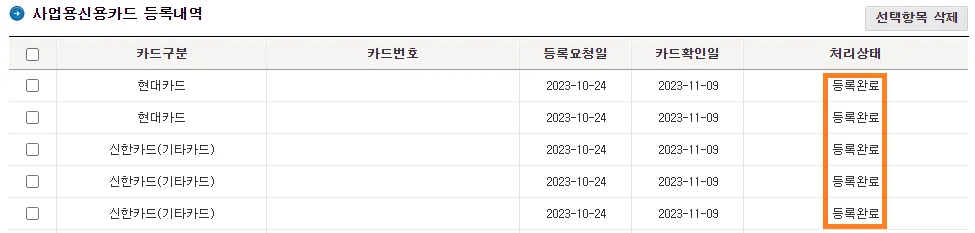 ⑥ 등록을 마치면, 하단에 [사업용 신용카드 등록내역] 화면이 보입니다. 카드 확인 기간이 지나면 자동으로 처리상태가 [등록완료]로 바뀝니다.