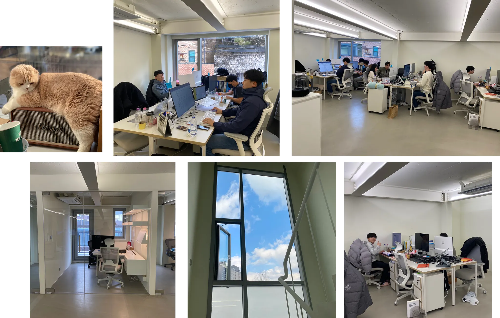 사무실은 임원실을 제외한 공간 모두 오픈형 공간으로 되어있고, 각 층마다 하나의 회의실이 있습니다. 그리고 크파의 마스코트 고양이 만수도 있어요!!