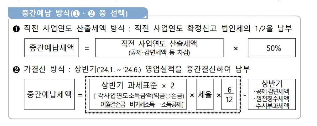 8월은 법인세 중간예납의 달입니다. 법인세의 신고/납부 기한은 각 사업연도 종료일 이후 3개월 이내이지만, 1년 전체 수입에 대해서 한번에 납부하게 된다면 기업의 자금 부담이 있을 수 있기 때문에 법인은 1) 직전 연도 기준, 2) 자기 계산 기준으로 6개월치 실적에 대한 법인세를 매년 8월에 납부하게 됩니다.