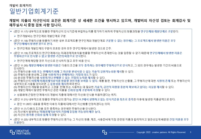이번 사례의 고객사 또한 개발비 회계처리를 위해 감사인과 사전 커뮤니케이션을 진행하고 있으며, 감사인의 눈높이에 맞는 증빙과 근거를 제시하기 위해 크리에이티브 파트너스와 함께 준비하고 있습니다.